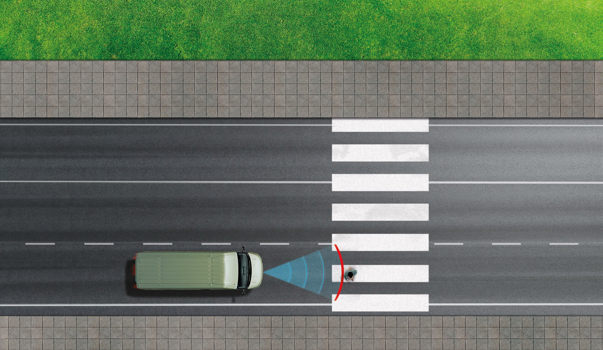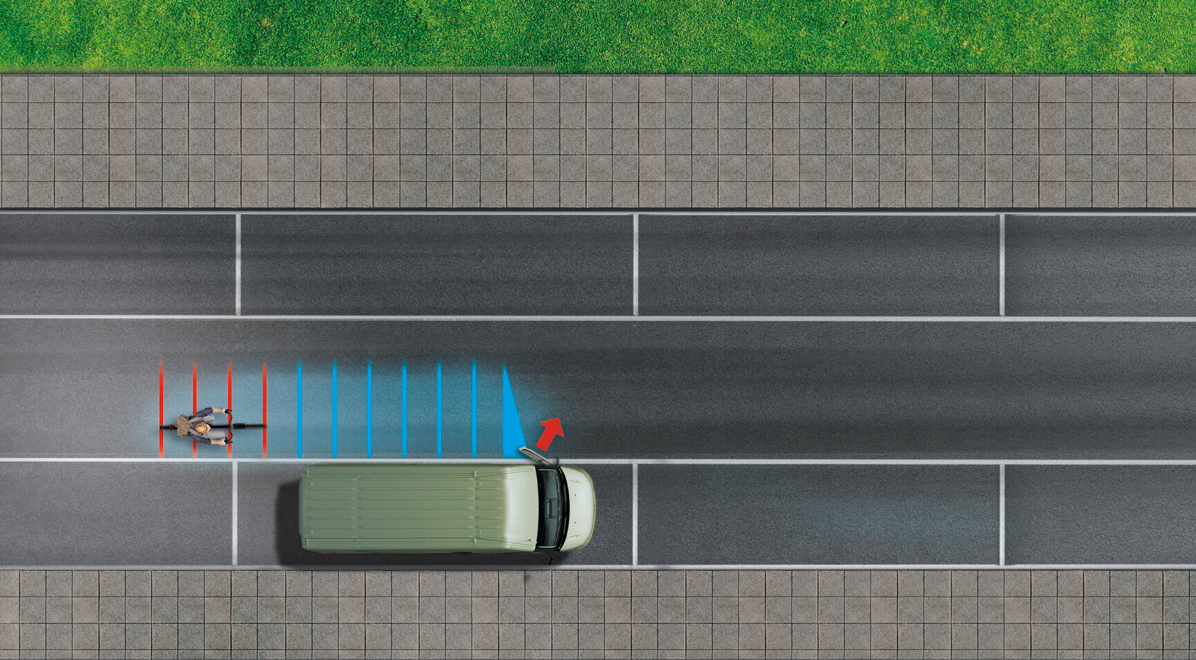 Das System reagiert auf zugelassene Fahrzeuge und gefährdete Verkehrsteilnehmer. Es verhindert Kollisionen mit langsamen Fußgängern und Radfahrern.