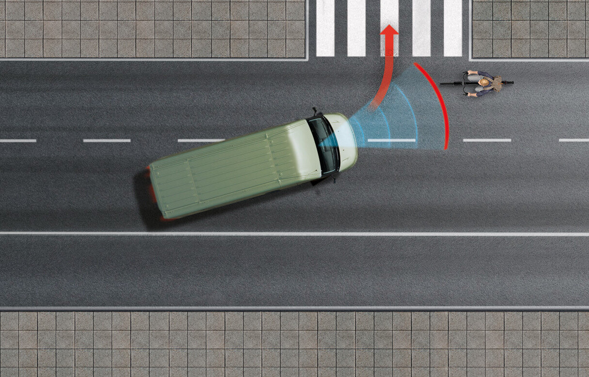 Features wie der neue Spurhalteassistent sowie der adaptive Tempomat mit Stop & Go und Funktionen für autonomes Fahren der Stufe 2 sorgen für mehr Sicherheit und weniger Ermüdung bei langen Arbeitstagen am Steuer. Fahrten bei hohem Verkehrsaufkommen und Frei-Haus-Lieferungen werden mit dem neuen, auf den Stadtverkehr ausgelegten Fahrerassistenzsystem zum Kinderspiel. Unter anderem stehen Ihnen Funktionen wie der Abbiegeassistent oder Querverkehrswarner hinten mit Bremseingriff zur Verfügung.